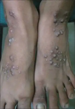 | Hyperpigmented papules and nodules | |