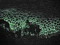 Pemphigus defines a group of autoimmune interepithelial blistering diseases that are characterized by loss of normal cell-cell adhesion (acantholysis), and by the presence of pathogenic (predominantly IgG) autoantibodies reacting against epithelial adhesion molecules.[13] Pemphigus is further divided in two major subtypes: pemphigus vulgaris (PV) and pemphigus foliaceus (PF). However, several other disorders such as IgA pemphigus, IgE pemphigus, pemphigus herpetiformis, drug induced pemphigus, Senear Usher syndrome and endemic pemphigus foliaceus exist; recognized by a dermatologist from the appearance and distribution of the skin lesions. It is also commonly diagnosed by specialists practicing otolaryngology- head and neck surgery, periodontists, oral and maxillofacial surgeons and eye doctors, as lesions can affect the eyes and mucous membrane of the oral cavity. Intraorally it resembles the more common diseases lichen planus and mucous membrane pemphigoid.[14] Definitive diagnosis requires examination of a skin or mucous membrane biopsy by a dermatopathologist or oral pathologist. The skin biopsy is taken from the edge of a blister, prepared for histopathology and examined with a microscope. The pathologist looks for an intraepidermal vesicle caused by the breaking apart of epidermal cells (acantholysis). Thus, the superficial (upper) portion of the epidermis sloughs off, leaving the bottom layer of cells on the "floor" of the blister. This bottom layer of cells is said to have a "tombstone appearance."