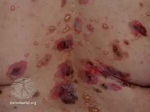 Pemphigus is a rare group of blistering autoimmune diseases that affect the skin and mucous membranes.[1] The name is derived from the Greek root "pemphix", meaning "pustule".[2]