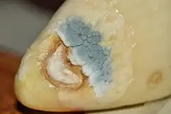 Initial symptoms of blue mold of garlic caused by Penicillium hirsutum include water-soaked or pale-yellow areas on the outer surface of scales.[7][8] As disease progresses, a green to blue-green, powdery mold may develop on the surface of the lesions. Infected areas of fleshy scales are tan or gray when cut.[7][8] In advanced stages of disease, infected bulbs may disintegrate into a watery rot, often because of secondary infection by bacteria or yeasts.[7]