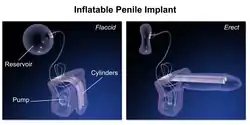 A penile implant is an implanted device intended for the treatment of erectile dysfunction, Peyronie's disease, ischemic priapism, deformity and any traumatic injury of the penis, and for phalloplasty or metoidioplasty, including in gender-affirming surgery. Men also opt for penile implants for aesthetic purposes. Men's satisfaction and sexual function is influenced by discomfort over genital size, which leads some to seek surgical and non-surgical solutions for penis alteration.[1] Although there are many distinct types of implants, most fall into one of two categories: malleable and inflatable transplants.[2]