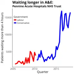 The trust was one of 26 responsible for half of the national growth in patients waiting more than four hours in accident and emergency over the 2014/2015 winter.[14]