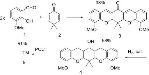 Condensation of two equivalents of o-vanillin with 4,4-dimethylcyclohexadienone (2) gives the five-ring ketone derivative (3). The reaction may be visualized as initial conjugate addition of phenoxide to the enone followed by interception of the resulting anion by the aldehyde carbonyl group. Catalytic hydrogenation then reduces both olefin pi-bonds as well as the ketone, to give (4). Re-oxidation of the alcohol thus formed with pyridinium chlorochromate affords pentomone.[2][3]