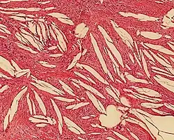 Cholesterol clefts of a periapical cyst of the jaw.
