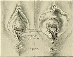 A perineal tear is a laceration of the skin and other soft tissue structures which, in women, separate the vagina from the anus. Perineal tears mainly occur in women as a result of vaginal childbirth, which strains the perineum. It is the most common form of obstetric injury.[1] Tears vary widely in severity. The majority are superficial and may require no treatment, but severe tears can cause significant bleeding, long-term pain or dysfunction. A perineal tear is distinct from an episiotomy, in which the perineum is intentionally incised to facilitate delivery. Episiotomy, a very rapid birth, or large fetal size can lead to more severe tears which may require surgical intervention.