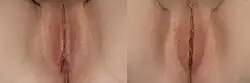 Perineoplasty: the pre-operative aspect (left), and the post-operative aspect (right) of the surgical correction of the perineum. | |