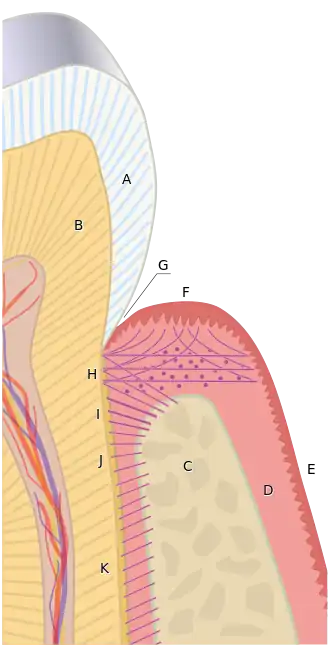![]() The tissues of the periodontium combine to form an active, dynamic group of tissues. The alveolar bone (C) is surrounded for the most part by the subepithelial connective tissue of the gingiva, which in turn is covered by the various characteristic gingival epithelia. The cementum overlaying the tooth root is attached to the adjacent cortical surface of the alveolar bone by the alveolar crest (I), horizontal (J) and oblique (K) fibers of the periodontal ligament. | |