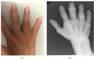 | Examination findings and radiograph illustrating periostitis of the right hand | |
