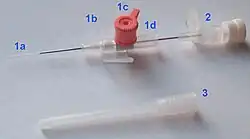 1. The catheter itself is composed of (a) a tip for insertion into the vein, (b) wings for manual handling and securing the catheter with adhesives, (c) a valve to allow injection of drugs with a syringe, (d) an end which allows connection to an intravenous infusion line, and capping in between uses.