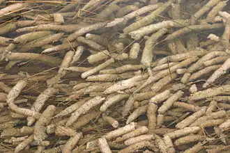 Periphyton is a complex mixture of algae, cyanobacteria, heterotrophic microbes, and detritus that is attached to submerged surfaces in most aquatic ecosystems. The related term Aufwuchs (German "surface growth" or "overgrowth", pronounced [ˈaʊ̯fˌvuːks] ⓘ) refers to the collection of small animals and plants that adhere to open surfaces in aquatic environments, such as parts of rooted plants.