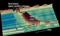 A time-space diagram of a peristaltic wave after a water swallow. High-pressure values are red, zero pressure is blue-green. The ridge in the upper part of the picture is the high pressure of the upper esophageal sphincter which only opens for a short time to let water pass.