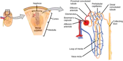 In the renal system, peritubular capillaries are tiny blood vessels, supplied by the efferent arteriole, that travel alongside nephrons allowing reabsorption and secretion between blood and the inner lumen of the nephron. Peritubular capillaries surround the cortical parts of the proximal and distal tubules, while the vasa recta go into the medulla to approach the loop of Henle.[1][2]