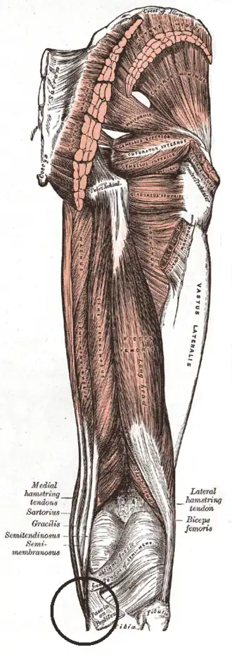 ![]() Muscles of the gluteal and posterior femoral regions. Area of pes anserinus is encircled at bottom. Sartorius, gracilis, semitendinosus and semimembranosus are labeled at bottom left. | |