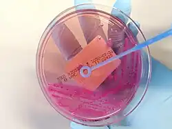 - ↑ Lemmen, Sebastian W.; Häfner, Helga; Zolldann, Dirk; Amedick, Günter; Lutticken, Rüdolf (2001). "Comparison of two sampling methods for the detection of Gram-positive and Gram-negative bacteria in the environment: Moistened swabs versus Rodac plates". International Journal of Hygiene and Environmental Health. 203 (3): 245–48. doi:10.1078/S1438-4639(04)70035-8. PMID 11279821.