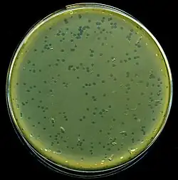 Phage typing is a phenotypic method that uses bacteriophages ("phages" for short) for detecting and identifying single strains of bacteria.[1] Phages are viruses that infect bacteria and may lead to bacterial cell lysis.[2] The bacterial strain is assigned a type based on its lysis pattern.[3] Phage typing was used to trace the source of infectious outbreaks throughout the 1900s, but it has been replaced by genotypic methods such as whole genome sequencing for epidemiological characterization.[1]