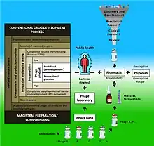 According to some, therapeutic phages should be prepared individually and kept in large phage banks, ready to be used, upon testing for effectiveness against the patient's bacterial pathogen(s). Intermediary or combined (industrially made as well as precision phage preparations) approaches could be appropriate.[129] However, it turns out to be difficult to reconcile classical phage therapy concepts, which are based on the timely adaptation of phage preparations, with current Western pharmaceutical R&D and marketing models. Repeated calls for a specific regulatory framework have not been heeded by European policymakers.[128] A phage therapy framework based on the Biological Master File concept has been proposed as a (European) solution to regulatory issues, but European regulations do not allow for an extension of this concept to biologically active substances such as phages.[130]