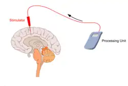 Deep brain stimulation is a surgical technique used to alleviate patients from phantom limb pain. It is typically reserved for refractory cases or when all other therapeutic interventions have not provided relief. Prior to surgery, patients undergo functional brain imaging techniques such as PET scans and functional MRI to determine an appropriate trajectory of where pain is originating.[48] Surgery is then carried out under local anesthetic, because patient feedback during the operation is needed. In the study conducted by Bittar et al., a radiofrequency electrode with four contact points was placed on the brain. Once the electrode was in place, the contact locations were altered slightly according to where the patient felt the greatest relief from pain. Once the location of maximal relief was determined, the electrode was implanted and secured to the skull. After the primary surgery, a secondary surgery under general anesthesia was conducted. A subcutaneous pulse generator was implanted into a pectoral pocket below the clavicle to stimulate the electrode.[17] It was found that all three patients studied had gained satisfactory pain relief from the deep brain stimulation. Pain had not been completely eliminated, but the intensity had been reduced by over 50% and the burning component had completely vanished.[17] Additional studies have corroborated these findings, though more rigorous interventional trials are needed to better elucidate the safety and efficacy of this procedure.[49][50] A recent systematic review found mixed results, also suggesting the need for additional randomized, controlled studies.[48]