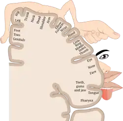 While the sensation often affects the part of the limb farthest from the body, such as the fingers or toes, other body parts closer to the brain, such as the arm or leg, can still experience similar sensations.[10] It is thought that phantom pain more commonly involves the part of the limb farthest from the body because of its larger cortical representation within the somatosensory cortex.[11]