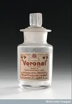 In 1903, Hermann Emil Fischer and Joseph von Mering disclosed their discovery that diethylbarbituric acid, formed from the reaction of diethylmalonic acid, phosphorus oxychloride and urea, induces sleep in dogs. The discovery was patented and licensed to Bayer pharmaceuticals, which marketed the compound under the trade name Veronal as a sleep aid beginning in 1904. Systematic investigations of the effect of structural changes on potency and duration of action led to the discovery of phenobarbital at Bayer in 1911 and the discovery of its potent anti-epileptic activity in 1912. Phenobarbital was among the most widely used drugs for the treatment of epilepsy through the 1970s, and as of 2023, it remains on the World Health Organization's List of Essential Medicines.[9]