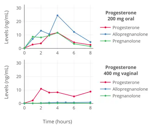 Progesterone is metabolized into allopregnanolone and pregnanolone, which are neurosteroids and potent potentiators of the GABAA receptor.[65][66] The conversion of progesterone into these metabolites is catalyzed by the enzymes 5α- and 5β-reductase and 3α-hydroxysteroid dehydrogenase, and occurs primarily in the liver, but also occurs in reproductive endocrine tissues, the skin, the brain, and other tissues.[67] Due to extensive first-pass metabolism with oral progesterone, about 80 to 90% or more of progesterone is rapidly transformed into these metabolites, and massive quantities of these neurosteroids are consequently formed and circulate throughout the body and brain.[68][69][70][71] It is for this reason that commonly reported side effects of oral progesterone include dizziness, drowsiness, sedation, somnolence, and fatigue.[65][66] Both oral and sufficiently high doses of intramuscular progesterone can produce these sedative effects.[72][73][74] However, compared to oral progesterone, the levels of these neurosteroids have been found to be very low with parenteral routes like vaginal and intramuscular progesterone.[64][75] As with the bioavailability of oral progesterone, there is high interindividual variability in the formation and levels of allopregnanolone and pregnanolone with oral progesterone.[17] As a result, some individuals may experience considerable central depressant effects with oral progesterone, whereas others may experience minimal such effects.[17]