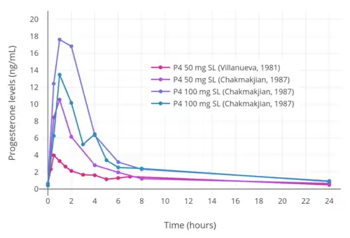 A number of other studies have also investigated the use of progesterone by sublingual administration.[111][112][113][108] Older studies have also explored sublingual progesterone.[114][115][116][117] A study of sublingual progesterone for luteal support in patients undergoing embryo transfer found that after sublingual administration of 50 or 100 mg progesterone dissolved in a 1 mL suspension, peak levels of progesterone were reached in 30 to 60 minutes and were on average 17.61 ± 3.78 ng/mL with the 100-mg dose.[111][112] However, the duration was short, with levels of less than 5 ng/mL at 6 hours, and re-administration had to be done two or three times per day for adequate circulating levels of progesterone to be maintained throughout the day.[111][112] Another study found that sublingual progesterone had to be administered at a dose of 400 mg every 8 hours to achieve circulating levels similar to those produced by 100 mg/day intramuscular progesterone.[111] One study administered 400 mg sublingual progesterone three times per day and achieved mean progesterone levels of 57.8 ± 37.4 ng/mL, which were similar to those produced by 50 mg/day intramuscular progesterone.[112]