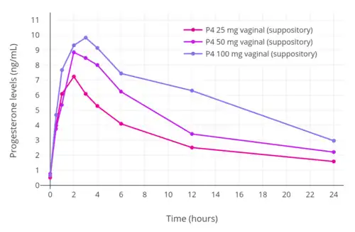 When oral progesterone is used at typical clinical dosages, only very low levels of progesterone are measured using reliable methods.[43][44][45] Following single doses of oral progesterone, peak levels of progesterone of 1.5 to 2.4 ng/mL with 100 mg and 2.8 to 4.7 ng/mL with 200 mg have been measured using LC–MS, liquid chromatography–tandem mass spectrometry (LC–MS/MS), and IA with adequate CS.[43][58][1] In one such study, although peak levels of progesterone were 2.2 ng/mL after a single 100 mg dose of oral progesterone, levels of progesterone remained significantly elevated for less than about 4 hours, and the average progesterone levels over a period of 24 hours were only 0.14 ng/mL.[45][1] For comparison, normal progesterone levels during the luteal phase of the menstrual cycle with LC–MS/MS are 6.7 to 22.2 ng/mL.[59] When IA alone has been used to measure progesterone levels with oral progesterone, far higher peak levels of 6.5 to 10.2 ng/mL, 13.8 to 19.9 ng/mL, and 32.3 to 49.8 ng/mL have been observed after single 100, 200, and 300 mg doses, respectively.[47][12] One IA-based study even reported maximal progesterone levels of 16 to 626 ng/mL (mean 247 ng/mL) with a single 300 mg dose of oral progesterone.[60][61]