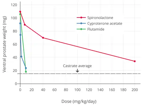 A comparative study of binding inhibition to the AR in rat prostate cytosol AR found IC50 values of 3 nM for DHT, 24 nM for cyproterone acetate, and 67 nM for spironolactone.[49]