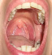 Some cases of pharyngitis are caused by fungal infection, such as Candida albicans, causing oral thrush.[25]