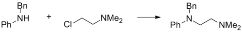 Phenbenzamine can be prepared by the reaction of N-benzylaniline with 2-chloroethyldimethylamine.[8][9]