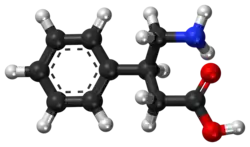 Phenibut is a derivative of the inhibitory neurotransmitter GABA.[5] Hence, it is a GABA analogue.[5] Phenibut is specifically the analogue of GABA with a phenyl ring substituted in at the β-position.[5] As such, its chemical name is β-phenyl-γ-aminobutyric acid, which can be abbreviated as β-phenyl-GABA.[5] The presence of the phenyl ring allows phenibut to cross the blood–brain barrier significantly, unlike GABA.[5] Phenibut also contains the trace amine β-phenethylamine in its structure.[5]