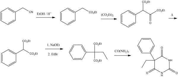The first of these methods consists of a Pinner reaction of benzyl cyanide, giving phenylacetic acid ethyl ester.[58] Subsequently, this ester undergoes cross Claisen condensation using diethyl oxalate, giving diethyl ester of phenyloxobutandioic acid. Upon heating this intermediate easily loses carbon monoxide, yielding diethyl phenylmalonate.[59] Malonic ester synthesis using ethyl bromide leads to the formation of α-phenyl-α-ethylmalonic ester. Finally a condensation reaction with urea gives phenobarbital.[56]