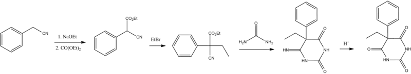 The second approach utilizes diethyl carbonate in the presence of a strong base to give α-phenylcyanoacetic ester.[60][61] Alkylation of this ester using ethyl bromide proceeds via a nitrile anion intermediate to give the α-phenyl-α-ethylcyanoacetic ester.[62] This product is then further converted into the 4-iminoderivative upon condensation with urea. Finally acidic hydrolysis of the resulting product gives phenobarbital.[63]