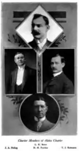 At the grand chapter meeting in July 1901, the constitution was amended to allow alumni chapters.[9] The Chicago Alumni chapter was chartered on November 5, 1901.[10] Its founders were Dr. E. W. Andrews, Dr. Charles M. Gleason, Dr. Frank Jay, Dr. Mortimer Frank, and Dr. D. E. W. Wenstrand.[10]