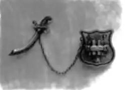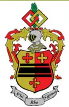 Phi Rho Sigma's colors are gold and scarlet.[2][5] Its badge was originally a gold shield with the letters Φ, Ρ and Σ in black enamel, surrounding a raised pair of clasped hands in gold over an open book in gold. The Φ was in the upper left-hand corner, the Ρ in the upper right-hand corner, and the Σ below at the apex of the shield.