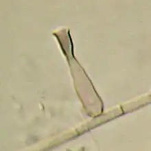Phialophora verrucosa produces vase-shaped phialides with dark brown, cup-shaped collarettes.[6] Each phialide is typically 3–4 μm wide and 4–7 μm long.[7] Teardrop-shaped,[3] smooth-walled conidia are formed at the apices of the collarettes and accumulate in clusters. Conidia are typically 2.5–4 μm by 1.5 3 μm in size.[8] Hyphae are brown, cylindrical, and septate and are composed of thick-walled cells.[9] The hyphae do not produce conidia.[3]P. verrucosa grows well over a range of temperatures, 21–37 °C (70–99 °F) with an optimal growth temperature of 30 °C (86 °F).[10] Colonies grow slowly on oxalic acid and malt extract agar.[3] Grown on Sabouraud's agar at 3 °C (37 °F), the colony attains a diameter of 3–4 cm after 2 weeks incubation.[7]