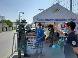 Both the Armed Forces of the Philippines (AFP) and the Philippine National Police (PNP) have been deployed by the national government as front liners in addressing the pandemic.[66] PNP Chief Archie Gamboa tasked his agency to increase their visibility in various communities and to arrest individuals and groups "without warning" involved in activities that violate quarantine protocols on physical distancing and mass gatherings.[67] Border checkpoints maintained by the AFP, PNP, and the Philippine Coast Guard were installed in areas with community quarantine to control the traffic of people and goods and ultimately contain the spread of the virus across regions during the pandemic.[68]