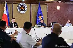 The Presidential Security Group (PSG) have implemented a "no-touch" policy during meetings by President Duterte with politicians, reporters, and visitors.[31] Several government officials announced that they would donate portions of their salaries to help fund government initiatives responding to the pandemic. President Duterte said that he would donate a month of his salary, which amounts to ₱400,000, to the Office of Civil Defense.[32] Some senators and around 200 members of the House of Representatives would also donate their salaries for May, while most Cabinet members would donate at most 75 percent of their salaries.[33][34]