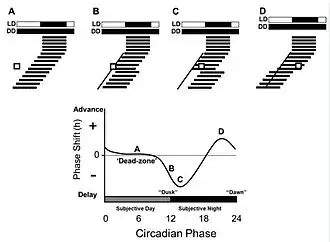 Pittendrigh developed his model based on the phase-response curve, which visualizes the effect of short light pulses on organisms that were free-running (not entrained to a zeitgeber). Pittendrigh determined that an organism's response to light depended on when the signal was presented. It was determined that exposure to light in the organism's early subjective night (the early portion of an organism's "normal" dark period) produced a delay in onset of activity in the following day (phase delay). Additionally, light exposure in the late subjective night resulted in advanced activity in the following day (phase advance).[8] The phase changes experienced by the organism could be represented by a phase-response curve consisting of portions including the advance zone, delay zone, and dead zone. This model became widely accepted over Aschoff's parametric model, but it is still unclear which model most effectively explains the process of photoentrainment.[7]