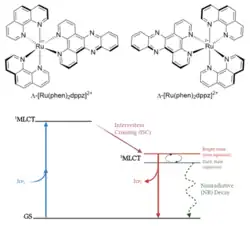 Alternatively, photoswitches may themselves be emissive and exhibit environmental control over their properties. One such example is a class of ruthenium polypyridyl coordination complexes. Typically they contain two bidentate bipyridine or phenanthroline ligands and an extended phenanthroline-phenazine bidentate ligand such as dipyrido[3,2-a:2,3-c]phenazine (dppz).[8] These complexes have an accessible metal to ligand charge transfer excited state (1MLCT) which undergoes rapid intersystem crossing to a 3MLCT state due to the strong spin-orbit coupling of the ruthenium center. These excited states are localized on the extended ligand phenazine nitrogens, and emission occurs from the 3MLCT state. Hydrogen bonding interactions such as the presence of water around these nitrogen atoms stabilizes the 3MLCT state, quenching the emission process. Thus, by controlling whether an aqueous or otherwise protic polar solvent is present, emissive behaviors can be "turned on/off", and alternation between "bright states" and "dark states" is facilitated. This light switch behavior makes these and similar complexes of recent interest in photopharmacological applications such as photodynamic therapy.