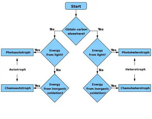 | From organics (Heterotroph) | Chemoheterotroph | Photoheterotroph |