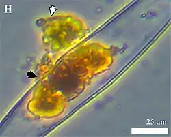 | Sporangium (white arrow) with appendage into diatom (black arrow) | |
