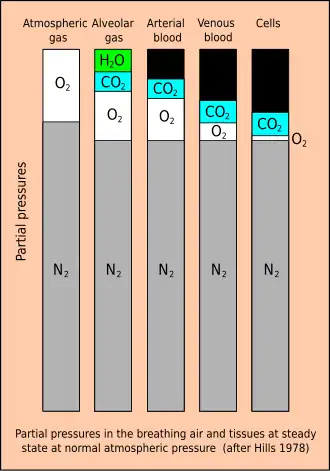 There is a metabolic reduction of total gas pressure in the tissues.[27] The sum of partial pressures of the gas that the diver breathes must necessarily balance with the sum of partial pressures in the lung gas. In the alveoli the gas has been humidified by a partial pressure of approximately 63 mbar (47 mmHg) and has gained about 55 mbar (41 mmHg) carbon dioxide from the venous blood. Oxygen has also diffused into the arterial blood, reducing the partial pressure of oxygen in the alveoli by about 67 mbar(50 mmHg) As the total pressure in the alveoli must balance with the ambient pressure, this dilution results in an effective partial pressure of nitrogen of about 758 mb (569 mmHg) in air at normal atmospheric pressure.[27]