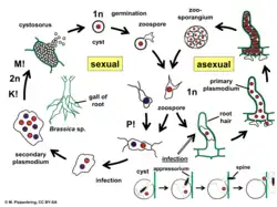The Phytomyxea are a class of parasites that are cosmopolitan, obligate biotrophic protist parasites of plants, diatoms, oomycetes and brown algae.[1] They are divided into the orders Plasmodiophorida (ICZN, or Plasmodiophoromycota, ICBN) and Phagomyxida.[2] Plasmodiophorids are best known as pathogens or vectors for viruses of arable crops (e.g. club root in Brassicaceae, powdery scab in potatoes, and rhizomania in beets, especially sugar beets and some spinaches).[3]