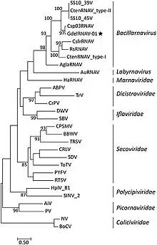 - ↑ Le Gall, Olivier; Christian, Peter; Fauquet, Claude M.; King, Andrew M. Q.; Knowles, Nick J.; Nakashima, Nobuhiko; Stanway, Glyn; Gorbalenya, Alexander E. (2008-04-01). "Picornavirales, a proposed order of positive-sense single-stranded RNA viruses with a pseudo-T = 3 virion architecture". Archives of Virology. 153 (4): 715–27. doi:10.1007/s00705-008-0041-x. PMID 18293057. S2CID 2303309.