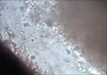 | White piedra-KOH 10% wet mount of affected hairs showed septate hyaline hyphae arranged perpendicular to hair shaft | |