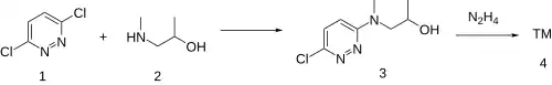 The reaction between 3,6-Dichloropyridazine [141-30-0] (1) and 1-(Methylamino)-2-propanol [16667-45-1] (2) gives CID:12237595 (3). Reaction with hydrazine completes the synthesis of Pidralazine (4).