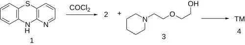 The reaction of 1-azaphenothiazine [261-96-1] (1) with phosgene gives 1-azaphenothiazine-10-carbonyl chloride [94231-78-4] (2). The reaction of this reactive intermediate with 2-[2-(piperidyl)ethoxy]ethanol [3603-43-8] (3) gives the ester, thus completing the synthesis of Pipazethate (4).