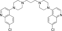 Piperaquine is an antiparasitic drug used in combination with dihydroartemisinin to treat malaria. Piperaquine was developed under the Chinese National Malaria Elimination Programme in the 1960s and was adopted throughout China as a replacement for the structurally similar antimalarial drug chloroquine. Due to widespread parasite resistance to piperaquine, the drug fell out of use as a monotherapy, and is instead used as a partner drug for artemisinin combination therapy. Piperaquine kills parasites by disrupting the detoxification of host heme.