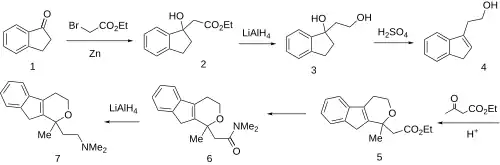 Pirandamine can be synthesized starting from 1-indanone.[4] The Reformatsky reaction between 1-indanone (1) and ethyl bromoacetate in the presence of zinc gives ethyl 2-(1-hydroxy-2,3-dihydroinden-1-yl)acetate (2). The reduction of the ester with ester with lithium aluminum hydride (LiAlH4) gives 1-(2-hydroxyethyl)-2,3-dihydroinden-1-ol (3). Acid-catalyzed dehydration then leads to indene-3-ethanol (4). Acid-catalyzed condensation with ethyl acetoacetate then gives (5). The saponification of the ester then gives the corresponding acid. The reaction of this with ethyl chloroformate gives a mixed anhydride, and further reaction of this with dimethylamine then leads to the amide (6). Reduction with lithium aluminium hydride completes the synthesis of pirandamine (7).