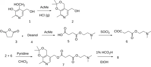 Cyclic ketal formation between pyridoxine [33605-94-6] HCl: [58-56-0] (1) and acetone resulted in alpha4,3-O-Isopropylidene Pyridoxine [1136-52-3] (2). In the other arm of the synthesis succinic anhydride [108-30-5] (3) is then esterified with Deanol [108-01-0] (4) gives Yakton [10549-59-4] (5). Halogenation of the remaining carboxyl group with thionyl chloride gives PC135056269 (6). In a convergent synthesis, esterification between 2 and 6 gives 7. The last step consists of deblocking the protecting group by hydrolysis with 1% formic acid in ethanol to give the product (8).